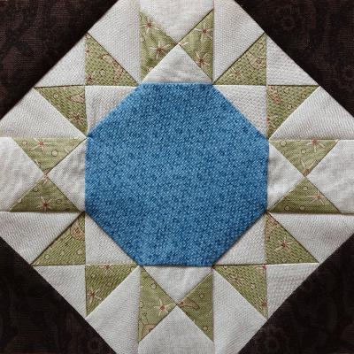 Dort gibt es auch Schablonen, die aber für einen viel grösseren Block gedacht sind. Ich habe den Block für 6 Inch angepasst. Die Reihenfolge der Patches und die Richtung des Fadenlaufs kann man auch diskutieren - ich wollte, dass die Stundenglasblöcke alle gleich genäht sind und dann wie eine Sonnenblume (in der Runde) zusammengesetzt werden. Das bedeutet eine Menge Y-Nähte, aber die habe ich ja jetzt mehrfach geübt... Darum habe ich erst die Stundenglasblöcke genäht, dann die Drachenformen an vier davon, dann alle um das Oktagon herum angenäht, danach die Zwischennähte genäht und zuletzt die Dreiecke an den Kanten.