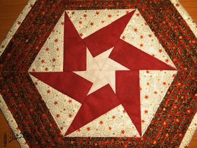 Hierbei sind die Dreiecke "Sternchen mit Rot" und nicht "Rot mit Sternchen". Um das Ganze noch ein wenig lebhafter zu gestalten habe ich den roten "Zipfel" ein wenig gekürzt und durch den Stoff "einfach hell" ersetzt. Dadurch kam dieser helle Mittelstern zustande. Genäht habe ich ihn genauso wie das Hexagondeckchen aus Dreiecken.