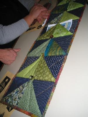 Die eine Patchworkarbeit war mit grünen Stoffen gearbeitet und hatte (ca. 12 ?) dreieckige Einschubtaschen (Tannenbaumform). Format des Behangs: ungefähr 1m hoch und vermutlich 15 - 20 cm breit. Abschluss oben eine Dreiecksspitze.