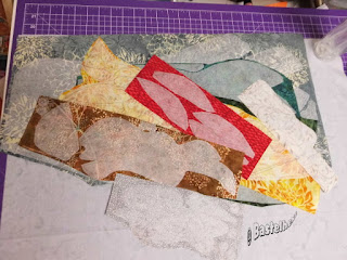 Für meine Wände war die Größe (31" x 36") leider zu groß. Aus diesem Grund habe ich mir eine Vorlage in kleinerem Maßstab gezeichnet und ich bin momentan über mein Werk ganz happy und auch ein wenig stolz. Wenn mein Wandquilt fertig sein wird hat er dann die Größe von maximal 24" x 26". Für's erste habe ich die ganzen Applikationsteile auf den Hintergrundstoff aufgebügelt. Nun kann es ans Aufnähen gehen. Ich werde hierbei die Technik "Applikationen mit offenen Kanten" (raw-edge applique with fusible backing) anwenden. Diese Technik hatte ich auch schon bei meinem "Vogelbild" angewandt.