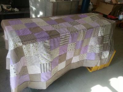 @Tinka: gequiltet hab ich noch nicht, aber die Fleece-Rückseite vorbereitet. Ich werde es mir leicht machen und mit fliederfarbenem Garn diagonal durch die braun-taupe-Quadrate quilten. Sicher gar nicht so leicht bei der Größe. |
