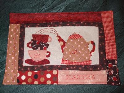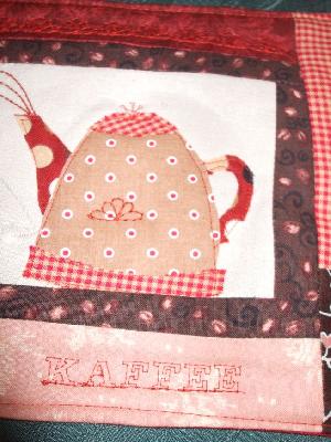 Hier könnt ihr eines sehen, die anderen sind im Prinzip mit den gleichen Stoffen nur die Reihenfolge im Rand ist ein wenig anders. Im Rand habe ich dann noch "Kaffee" u. "Tee" eingestickt, sowie ein paar Zierstiche meiner Näma ausprobiert.