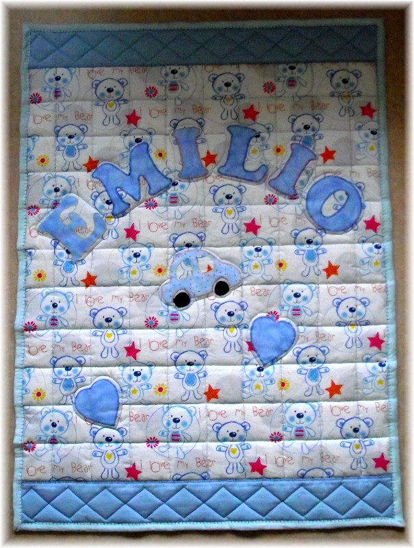 Dann war noch die Frage wie welche Buchstabenform und was mache ich noch auf die Decke, so kam noch ein Auto und zwei Herzen hinzu. Schlimm war es her raus zu finden "wie Steppe ich die Decke?" die Bären sind in verschieden farbigen Kreisen. So habe ich die Buchstaben auch in verschieden Farben Appliziert.