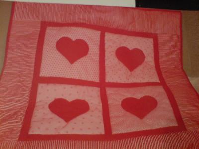 Hier habe ich meine erste Babydecke genäht, ein Geschenk zur Geburt der Tochter meiner Freundin. Die Herzchen sind per Hand appliziert.