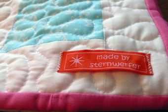Ich hab eine ganze Weile hin- und her versucht ein anderes Muster zu Quilten und zwar einfache Schleifen nach links und rechts. Guter Plan – Ausführung schwierig, so schwierig, dass ich lieber beim alten Muster geblieben bin. Das kann meine Maschine schon! Nein ehrlich, ich bilde mir ein, dass nicht nur ich dazulerne, sondern meine Nähmaschine auch. Wie auch immer, hier ist der fertige Quilt, mit meinem Stoffetikett darauf. Er ist etwa 90 x 110 cm groß. Ich hoffe, er gefällt Euch.