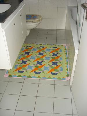 Und dann schaute ich mal das Badezimmer an, nahm den alten Badezimmerteppich raus auf den Müll, strich noch ein paar Mal Latexmilch auf die Rückseite des Quilts, damit er nicht rutscht, und nun ist er im vollen Einsatz.