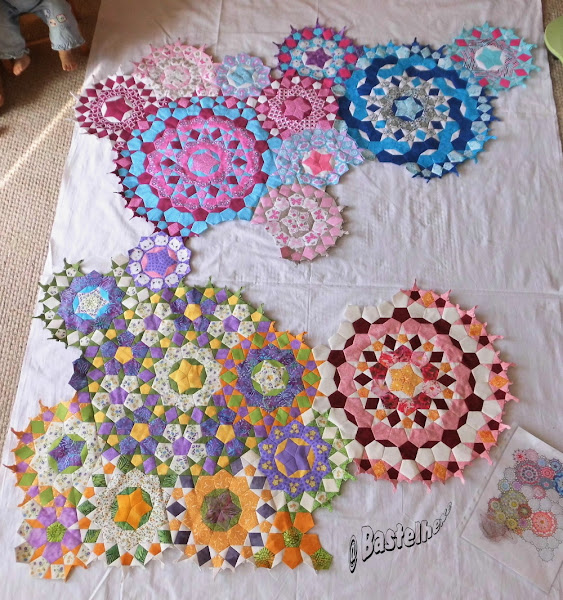 schaut mal, ich hab schon mal ein "Gesamtbild" von meinen bisherigen Teilen gemacht. 57 % sind zusammengenäht. Und weil ich grad so bei Zahlen bin, daß was ihr hier bis jetzt seht sind insgesamt 1963 Stoffteile, aber noch gut 1000 Teile fehlen noch.