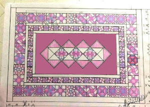 Ich habe ja den Originalquilt größenmäßig und auch anordnungsmäßig abgeändert. Darum werde ich jetzt erst die Quadrate vom Außenkranz fertig nähen. Danach kann ich mir ausrechnen, wie groß ich die kleinen Quadrate von dem mittleren Innenkreis nähen muß. Die dunkle Innenfläche sowie die rosanen Streifen dazwischen sind dann zum "Austarrieren" und werden entsprechend angepaßt.