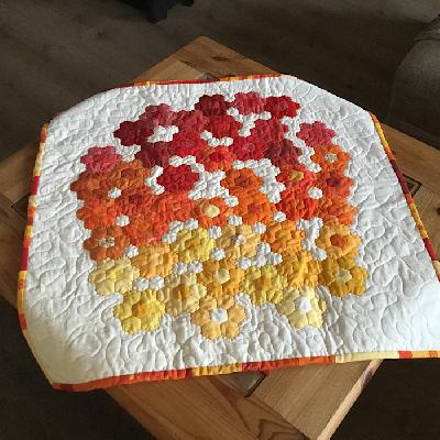 Eigentlich war es als Wandbehang gedacht. Als ich es dann fertig mit dem quilten war, gefiel es mir als Mitteldecke besser. Die quadratische Form der Blüten bot sich dafür an.