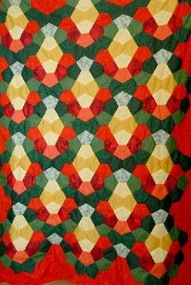 Das gesamte Top ist mit der Hand genäht.Ich habe dazu einige Urlaubsreisen gebraucht aber nun ist das Top fertig.Die Rückseite wird gelb und die Einfassung dunkel grün. Dann kommt noch die Quilterei.Da ich Handquilten nicht kann(Daumengelenksarthrose) werde ich eine für mich neue Technik versuchen.Ich will in den gelben Feldern, kleine Knöpfe annähen die dann auch die Rückseite fixieren. Im roten Rand werde ich mit der Maschine quilten.Was haltet ihr von der Idee?