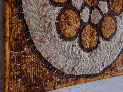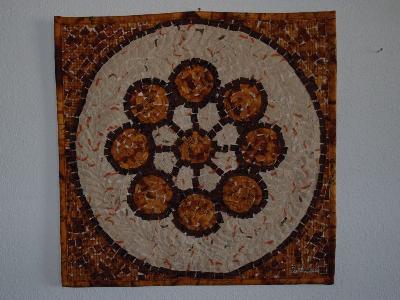 So, dann zeige ich Euch heute, nach längerer Forums-Abstinenz, mal wieder was von mir... Mein Wandbehang, der nach einem Bodenmosaik des Markusdoms in Venedig entstanden ist, hat eine Größe von 42x41 cm. Die einzelnen Stoffschnipsel haben eine Kantenlänge von ungefähr 1 cm. Ich habe sie nicht nachgezählt, aber so rein rechnerisch sind es über 1700 Schnipsel. Die Bodenmosaike haben mich letztes Jahr im Urlaub so fasziniert, dass ich mehrere fotografiert hatte. Seitdem wartetenn sie auf eine kreative Umsetzung. Ich habe dieses aber ein weinig abgeändert. Wenn es Euch interessiert, wie das Mosaik im Original aussieht, fahrt auch mal hin, es lohnt sich! Oder aber ich kann ein Foto posten....