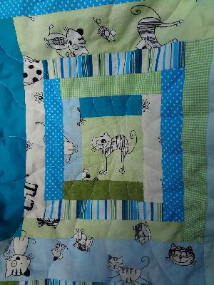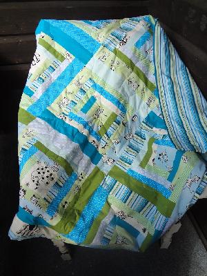 Dies ist mein 1. Quilt, den ich während der Schwangerschaft vor 2 Jahren für unsere Kleine (Wir wussten damals nicht, was es wird, und da wurden halt diese Farben ausgewählt)genäht habe. Ohne Rollschneider, Schneidematte etc., da ich keine Ahnung hatte, dass es das überhaupt gibt.