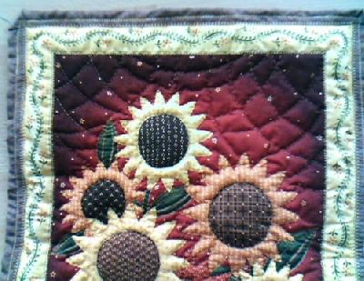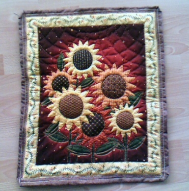 Die Blumen habe ich mit Bastelwatte ausgestopft, so dass ein 3D Effekt entsteht, den Rest habe ich frei mit der Hand gequiltet.