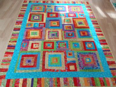 so nun endlich ist der Crazy-Bunt-Quilt für meine Tochter fertig. Hab mich die letzten drei Tage echt ins Zeug gelegt.