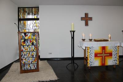 Die neuen Antependien hängen seit heute morgen bei uns im Dorf im Gottesdienstraum. Da wir ein Kirchspiel sind und die Kirche im Nachbarort steht, findet bei uns alle 14 Tage der Gottesdienst in der Friedhofskapelle statt. Unsere Gruppe, die "Mac Oeu", zu der auch die liebe Perle und und die liebe Eva-Rose gehören -wir sind insgesamt 6 Frauen - haben für diesen Raum zwei Antependien genäht. Die Anfrage kam im letzten November von einer Dame aus dem Kirchenvorstand, ob wir denn "so was" nähen könnten....