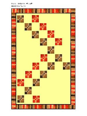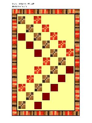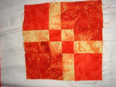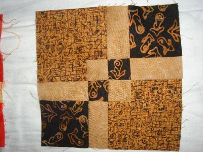 Nachdem ich mich aber von CrazyPatchwork fürs erste verabschiedet hatte, musste ja eine neue Idee her und da gefiel mir dieses Muster recht gut. Zum Hintergrund (das gelbe auf dem Bild)...der ist derzeit noch gar nicht vorhanden....ich hab nur an einen hellen Farbton gedacht, der sowohl zu den orangeroten, als auch zu den braunschwarzen Blöcken passst. Ich zeig Dir mal die Blöcke ein bisschen größer, in der Hoffnung, das man die Stoffe besser sehen kann.