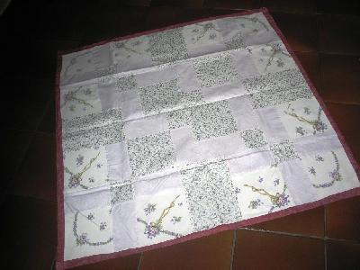 Meine Mutter hatte sich eine neue Decke unter den Weihnachtsbaum gewuenscht und mit gebeten, die alte (total verzogene) Decke darin aufgehen zu lassen. Die Bluemchenborten-Bloecke aussen rum sind aus der alten Decke und es war ganz schoen friemelig, die verzogenen Teile in halbwegs quadratische Form zu bekommen.