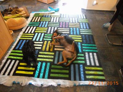 Ich hab vorhin den Fußboden gewischt und danach gleich die Ränder des Quilts begradigt, damit ich jetzt am Nachmittag die knapp 8 m Binding annähen kann. Aber irgendwie haben meine Hunde da was falsch verstanden. Seht selbst: