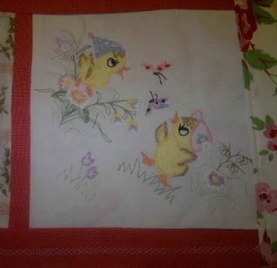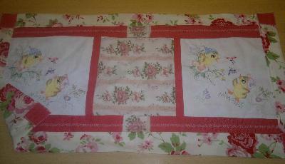 Aus 2 handgestickten Applikationen (ich bekam sie als Reste) habe ich einen frühlingshaften Tischläufer genäht. Ich hoffe, ich habe die alten Stoffe nicht doof in Szene gesetzt und eigentlich ist das auch viel zu verspielt für mich ... und dennoch kommt sie Ostern auf den Tisch ... mal sehen, bei wem: