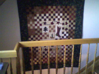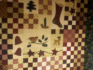 Bei den rot-beigen Quilt sind alle Motive ( Sterne , Girlanden, Elch..)von Hand appliziert. Die Stoffe sind zu 95% Thimbleberries und dadurch harmonieren sie sehr gut miteinander.