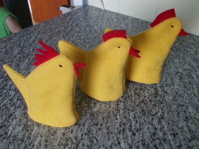 Das ist zwar kein Patchwork , aber ich wollte schon lange lustige Eierwärmer nähen . Die sind schon da .
