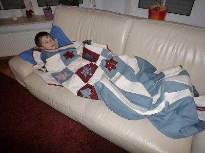 2009 habe ich vor der Geburt unserer Jüngsten einen Quilt für unseren "Mittleren" begonnen und gestern abend die letzten Stiche am Binding gemacht: