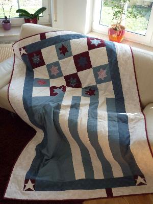 Er ist ca. 142 x 218 cm groß. Gequiltet habe ich vor allem im Nahtschatten und nur einwenig im "Sternenblock", damit auch der Flaggencharakter erhalten bleibt. Als Füllung habe ich zum ersten Mal ein Schurwoll-Vlies benutzt, das es in der gigantischen Breite von 240cm gab. Allerdings bringt das ja ordentlich Gewicht mit sich ...