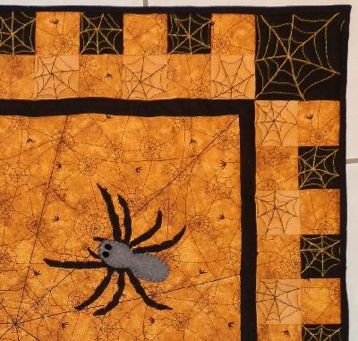 Gequiltet ist mit der Maschine. Im Mittelteil ist ein großes Spinnennetz gequiltet. Am Rand habe ich in die einfarbigen Quadrate kleine Netze gequiltet.