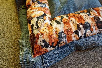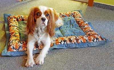 Den Stoff mit den Spaniels hab ich durch Zufall mal als Reststück gefunden und Herrchen hat eine alte Jeans gespendet. Raus gekommen ist eine kleine Decke (ca. 80x60 cm)mit Nestchen, die zum Glück auch noch recht edel aussieht (Aussage GöGa).