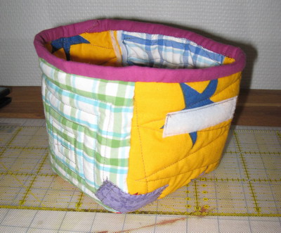 Der lila Flicken da unten mit sehr schlechtem Nähma-Zickzack (hab ich ja noch nie benutzt und dachte mir, wird schon gehen) verdeckt übrigens eine noch schlechtere Ecke, bei der ein Stückchen Volumenvlies und die Ecke grün rausguckten, weil schlecht genäht.