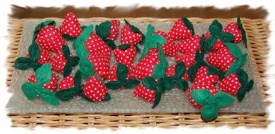Als ich letzte Woche kaufen war, entdeckte ich in der Obst und Gemüse Abteilung Erdbeeren. Voller Freude roch ich daran, und musste enttäuscht feststellen, dass sie noch nicht duften. Wie auch? Es ist ja noch Winter! Am Abend hatte ich dann solche Lust auf Erdbeeren, dass ich mir kurzerhand eine genähr hab (Schnitt ist von Tilda). Aber eine Erdbeere macht ja nicht satt, und so hab ich noch ein paar mehr genäht