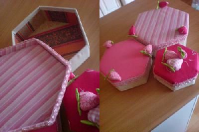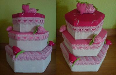 Eine gute Freundin bekommt heute Abend zu ihrem Geburtstag diese Torte. Sie besteht aus 3 sechseckigen Pappschachteln, die ich mit Vlies gepolstert, mit Stoff bezogen (beklebt) und mit ein paar Erdbeeren bestückt habe. Dies Spitze ist angenäht.