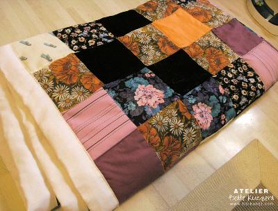 Für die Rückseite hab ich diesen Stoff, der war bei den Sachen dabei, war b estimmt eine alte Gardine aus den 70ger Jahren oder so bisl zu kurz, musste ein stück weisses bettlaken dranstückeln.