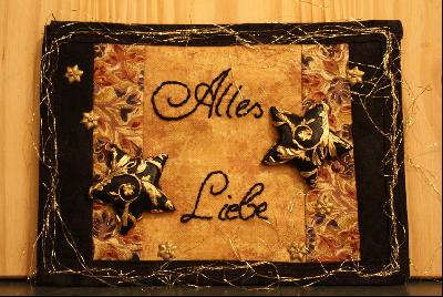 Hier seht ihr meinen allerersten AMC-Versuch. Vom Prinzip her gefällt mir die Karte gut, doch ich hatte unheimliche Schwierigkeiten mit dem Rand. Erst wollte ich den Rand mit einem engen Zickzackstich abschließen, nach einer Anleitung die ich hier mal im Forum gesehen hatte. Doch da machte meine Nähmaschine absolut nicht mit, der Himmel weiß warum, letztendlich hab ich alles wieder abtrennen müssen. Aber auch dieses Minibinding ist mir nicht so recht gelungen und das ist auch der Grund für das goldene Flitterzeug am Rand, das war nämlich gar nicht geplant ;o)