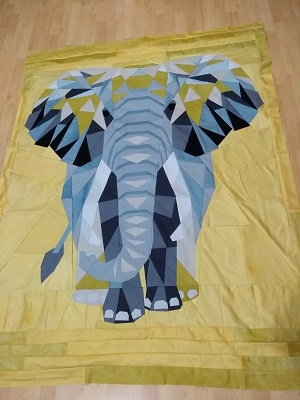 Ich überlege noch, ob ich das Ganze jetzt schmal mit einem Grauton einrahme, um dann nochmal einen gelben Streifen rundherum anzunähen.