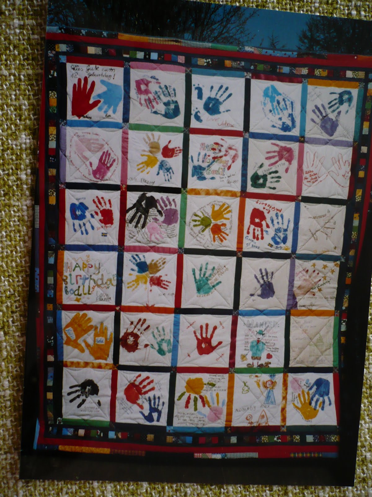 Ich finde auch die Hände im ganzen Quilt zuviel und würde sie im Rand verarbeiten. Dann hättest Du in der Mitte genug Platz um auf das Jubiläum -weil tatsächlicher Anlaß für den Quilt - einzugehen. Dazu könntest Du Fotos auf Transferfolie übertragen und einarbeiten und dazwischen ein paar Blöckchen und vielleicht."150 JAHRE SCHULE....." einfügen.