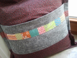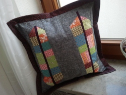 Inspiriert von http://annamariahorner.blogspot.de/ hab ich aus div. Stöffchen - Vorrat - ein Kissen versucht. Allerdings war ich kurz davor es sein zu lassen, denn immer wenn ich Dreiecke nähe oder es von der Form eines Rechtsechts abweich komm ich mit dem Spiegelverkehrtem zuschneiden in Konflikt und 20 cm von dem grauen Stoff hab ich auch verschnitten und schräg sind sie auch nicht geworden die bunten Stoffe.