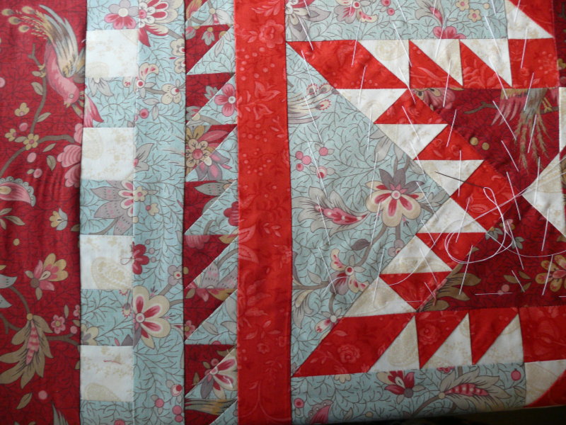 Meine Maschinennähte habe ich beendet und das Top liegt zum heften auf dem Tapeziertisch .