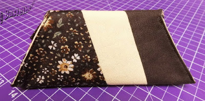 2 gleichgroße Stücke Stoff in verschiedenen Farben und in die Mitte einen schmaleren Streifen genäht. Die Vorgabe in der Anleitung, für den Mittelstreifen bei dem kleinen Täschchen 5 cm zu nehmen, erscheint mir im Nachhinein als etwas zu viel, wie ihr gleich sehen werdet. Beim nächsten Täschen werde ich den Mittelstreifen nur 4 cm breit zuschneiden. Der Schnitt selber wird diagonal zum Mittelstreifen aufgelegt und zugeschnitten. Dieses putzige Täschen kam dann heraus.