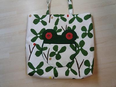 Der Frosch ist aus der Patchwork Spezial 02/2011, eigentlich als Utensilo, aber ich hab ihn einfach auf die Tasche genäht. Der vordere Teil (Maul) läßt sich als Vortäschchen verwenden und wird mit Klettband festgehalten. _________________ Alles Liebe,