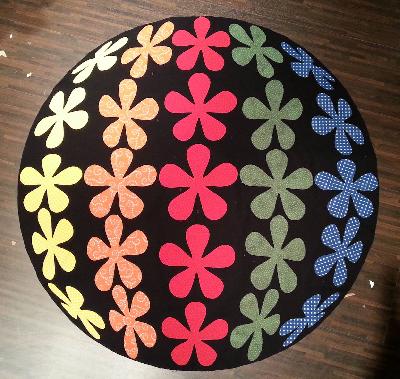 Hier ist mein nächstes Projekt, ein Flowerpowerquilt nach einem Design von Geta Gemma. Bislang habe ich die Blumen nur aufgeklebt, es folgt noch eine Art Trapunto, um die Blumen besser rauspoppen zu lassen, dann muss der Kreis noch auf einen Hintergrund appliziert werden, usw.