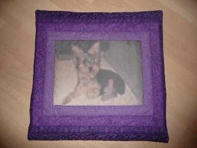 Für eine liebe Freundin ein Geburtstagsgeschenk im Eilverfahren. Habe ein Baby-Foto von ihrem Hund Gismo verwendet und mit Stoffen von Jinny Beyer umrandet.