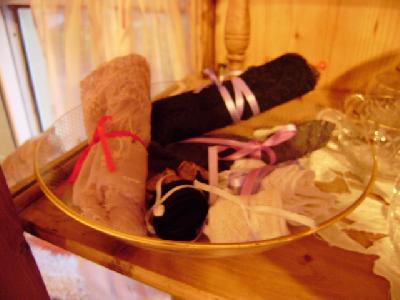 Dann hatte ich einen schönen Tausch, bei dem diese Holzwäscheklammern zu mir gewandert sind. Jetzt müssen meine Bänder und Spitzen endlich nicht mehr ungeordnet in einer Pappschachtel lagern, sondern warten in der Glas-Bowle-Schüssel auf ihren Einsatz. Die Spitzen gleich daneben auf einem Teller serviert.