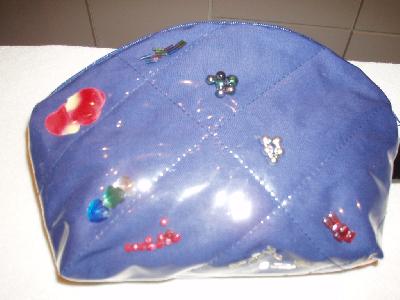 Beim ersten Täschchen habe ich einfachen Linonstoff genommen und eine Tischdeckenfolie übergelegt und abgesteppt.