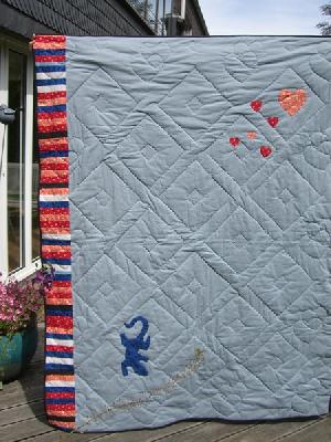 grade noch rechtzeitig ist er fertig, der Geburtstagsquilt für meine Tochter. An einigen Stellen ist er ziemlich schief und krumm, aber mir gefällt er. Auf der Rückseite kann man meine ersten Applikationen sehen.