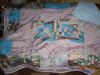 Quilt zum Geburtstag für meine Tochter. Die Stoffe sind alte Gardinen aus einem Seidenviskosemischgewebe und waren so rutschig wie sie ausschauen. Als Rücken habe ich einen hellblauen Fleece genommen.