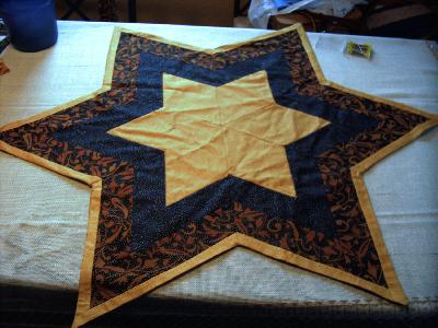 Der Kleine mißt von Zacke zu Zacke 45 cm. Er ist nur entstanden, weil ich einen Denkfehler beim Großen hatte. War so schlau die drei Streifen aneinander zu nähen.Leider paßte es dann nicht mit der Sternmitte zusammen. Also mußten diese "Reste" irgendwie verarbeitet werden.