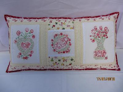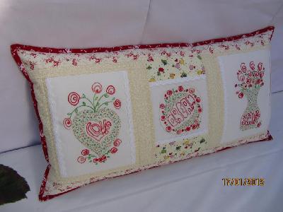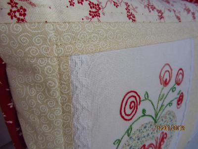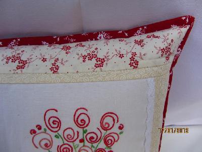 Ich hatte drei Stickbilder von unserer lieben Giuliana in Sontra bekommen und ich habe ein Redwork Kissen daraus gemacht und prima passende Stöffchen dazu gefunden wie ich finde