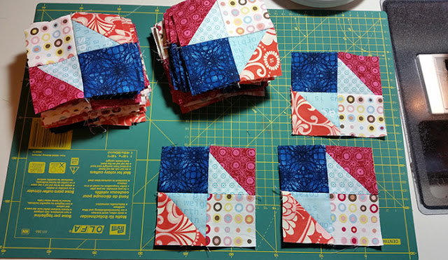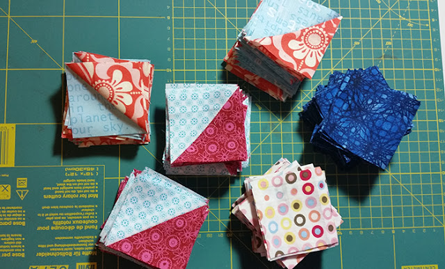ABER nun sind alle 232 Blöckchen genäht, gebügelt und auf exakt 2,5" geschnitten. Dazu je 80 Teile in 2,5" in 2 anderen Farben für die nächste Etappe geschnitten