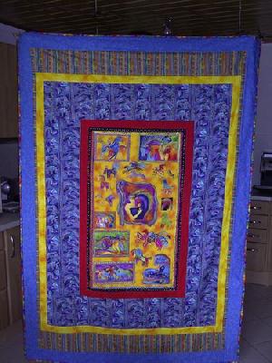 Habe ich für meinen ältesten und besten Freund genäht, er wird im Juli 40 und der Quilt soll ihn aufmuntern, er findet schon 3 Jahre lang keine Arbeit....Er hat überwiegend einsen in den Zeugnissen und sehr gute Umgansformen aber es klappt einfach nicht .....er ist zu alt....